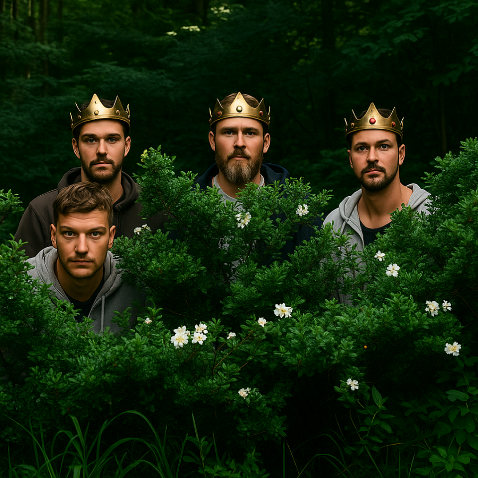 They hid behind the bushes till the man and his horse were almost near them. He tied the horse to a tree with a rope long enough for it to be free and feed itself by moving around. The four of them came out of the bushes and leapt at him, quickly holding him down and shuting his mouth so that he doesn't make any noise. They held out a dagger towards him and warned him that if he made any noise, they would kill him.